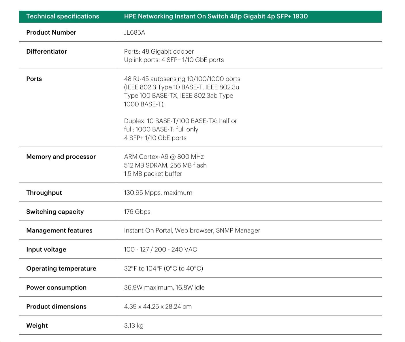 HPE Networking Instant On Switch 48p Gigabit 4p SFP+ Fanless 1930 JL685A (fanless)