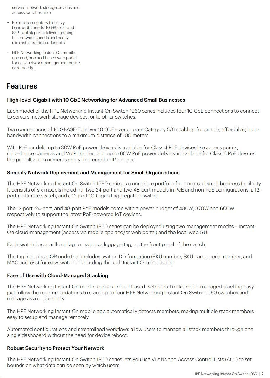 The Instant On Differentiators The Aruba Instant On mobile app allows you to set up, manage, and monitor Instant On switches and access points directly from your phone. Within the app, you get guided step-by-step instructions to install Instant On devices to get your network up and running quickly - no technical expertise required. And cloud-based access allows you to access the network from anywhere, at any time. Cloud-Managed Stacking The Aruba Instant On mobile app and cloud-based web portal make cloud-managed stacking easy - just follow the recommendations to stack up to four (4) 1960 switches and manage as a single entity. The Instant On mobile app automatically detects members, making multiple stack members easy to setup and manage remotely. Automated configurations and streamlined workflows allow users to manage all stack members through one single dashboard without the need for device reboot. Luggage Tag Each switch has a pull-out tag, known as a luggage tag, on the front panel of the switch. The tag includes a QR code that includes switch ID information (SKU number, SKU name, serial number, and MAC address) for easy switch onboarding through Instant On mobile app. Non-Intrusive, Aesthetic Design Aruba Instant On switches are designed to complement the sleek and clean look of the Instant On access points, and to blend discreetly into your site's environment. The 8-port models, as well as the 24- and 48-port non PoE+ models, are fan-less, making them ideal for quiet office deployments. High Performance With Flexible Options The series consists of two (2) PoE switches, and two (2) non-PoE switches including 24- and 48-port Gigabit Ethernet switches with two (2) dedicated 10G SFP+ ports and two (2) 10GBASE-T uplink ports on 24-/48- port models. The series also includes a 12-port 10Gbps aggregation switch with four (4) 10G SFP+ ports to meet the bandwidth requirements of small businesses. Optimized User Experience The Aruba Instant On mobile app provides common workflows for Instant On switches and access points making it easier to configure, monitor and manage your network remotely without the need for additional hardware like cloud keys. You can also update firmware on your Instant On devices directly from the cloud whenever you want, from wherever you are. Site Inventory And Topology View The site inventory view shows all Instant On switches and access points on a single interface, and the topology view provides an intuitive structure of all Instant On devices deployed on the network - allowing you to quickly identify non-functioning devices and troubleshoot accordingly. Network issues can be easily diagnosed with connectivity tests like Ping and Traceroute. Multi-Site Remote Management The cloud-hosted web interface and mobile app make it easy to remotely manage multiple sites, multiple networks, distributed deployments and multi-tenant deployments. Each site is logically separated and has its own configuration, statistics, guest portal, and admin read/write privileges. Instant On allows you to create three admin accounts per site, offering the option to lock accounts from accidental deletion or to allow your account to be managed by a trusted partner. Built-In Security Built-in security features protect your network from external threats by blocking malware attacks and keeping unauthorized users off the network. Network traffic can be filtered and access restricted based on MAC and IP address. No Hidden Fees All features are included in the price of the hardware - there are no recurring subscription or licensing fees. Expert-level support and industry leading limited lifetime warranty are also included, along with chat support for the life of the product. |