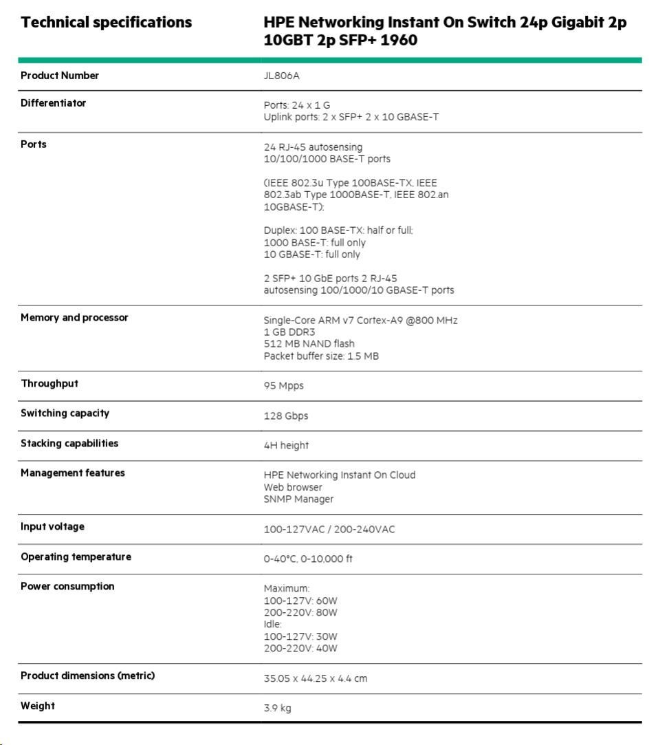 In today's digital-first environment, small businesses face many challenges to stay afloat and competitive. With tight budgets and limited technical expertise, they're struggling to keep up with the explosion of devices and bandwidth-heavy applications running on the network. To optimize both performance and investment, small businesses need cost-effective, next-gen networking solutions. The Aruba Instant On 1960 Switch Series is an easy-to-use and affordable wired solution for networks supporting IT, mobile and cloud applications. Aruba Instant On 1960 Switches are advanced, smart-managed, fixed configuration Gigabit stackable switches designed for small and growing businesses that are easy to deploy and affordable. These switches are designed to scale as business grows, making adding more employees, devices and applications simple. Aruba Instant On 1960 switches are made to handle today's bandwidth-heavy applications like voice and video conferencing, enabling consistent connectivity to improve user experience and application performance.