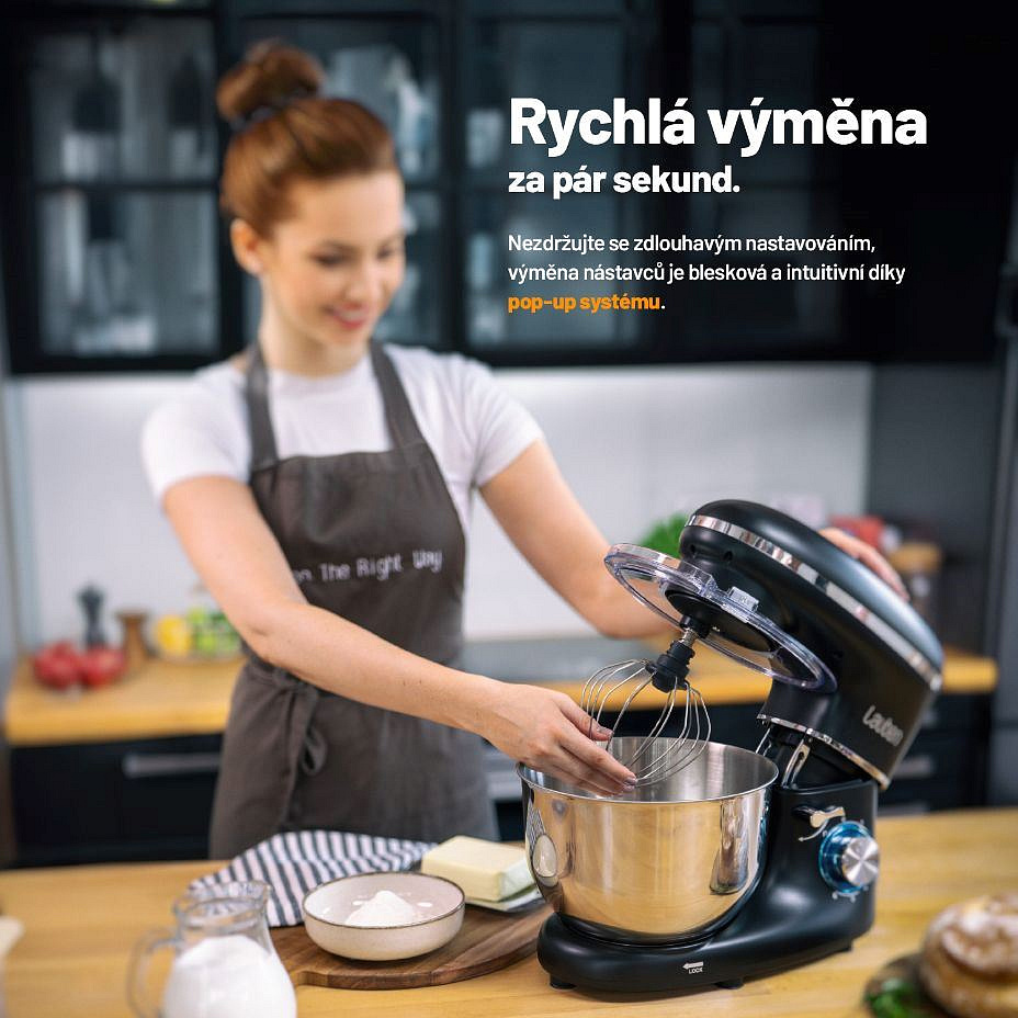 Vaření a pečení se stane ještě větší zábavou, s víceúčelovým kuchyňským robotem Lauben Kitchen Machine 550BC o výkonu 1400 W vše zvládnete snadno a rychle. Netřeba se bát ani přípravy tužších těst, celokovové převody si s vysokou zátěží poradí. Mísa o objemu 5,5 l z nerezové oceli pojme opravdu hodně a víko brání úniku obsahu při zpracování. Suroviny lze během provozu přidávat skrze plnicí otvor ve víku. Při všem, co dokáže, je robot menších rozměrů a nezabere tak na lince příliš místa. Svým designem ji však bude i zdobit. Přístroj pohodlně ovládáte jednou rukou díky One Touch systému, manipulaci usnadňuje také Pop-up systém sloužící k výměně nástavců. Robot disponuje hned několika nástavci, pro míchání, šlehání či hnětení a ke každému z nich naleznete v balení chutný recept pro inspiraci.