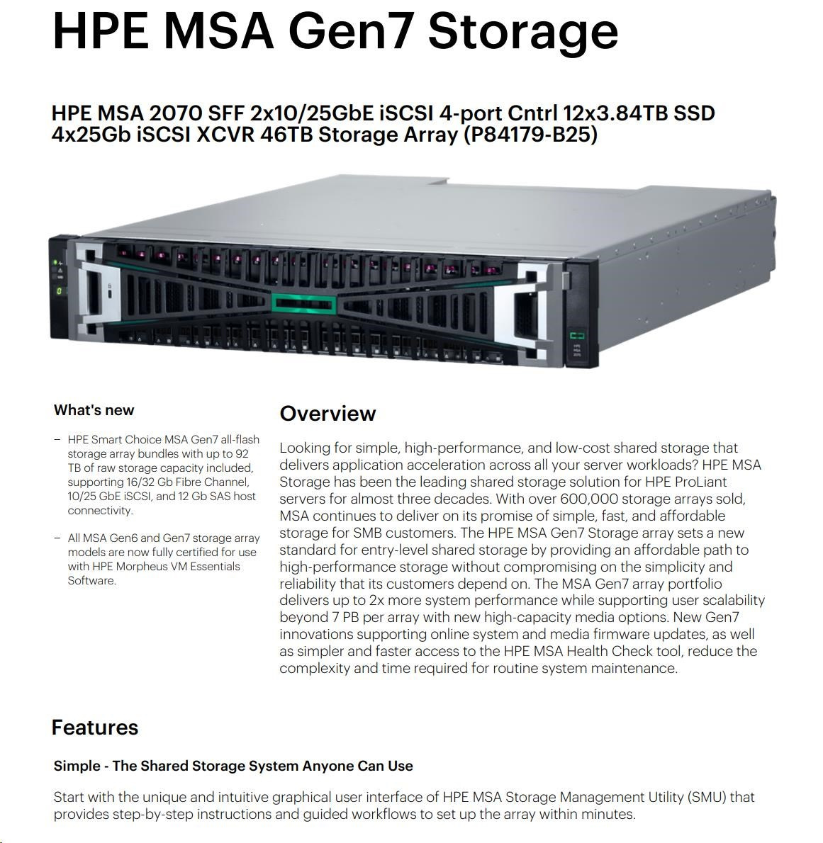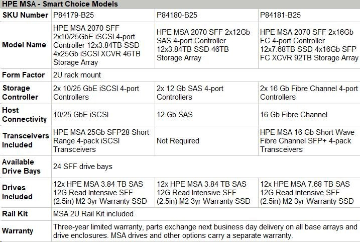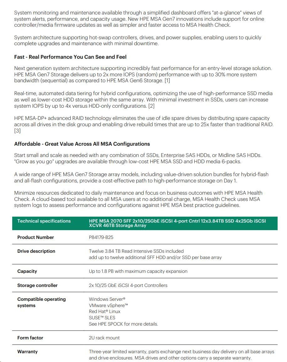 HPE MSA 2070 SFF 2x10/25GbE iSCSI 4-port Controller 12x3.84TB SSD 4x25Gb iSCSI XCVR 46TB Storage Array Smart Choice.