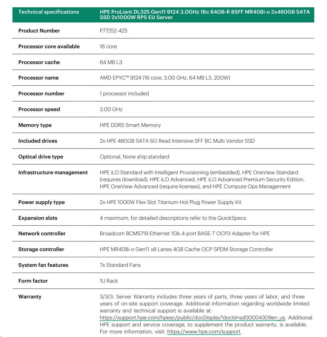Model Name | HPE ProLiant DL325 Gen11 9124 3.0GHz 16c 64GB-R 8SFF MR408i-o 2x480GB SATA SSD 2x1000W RPS EU Server |