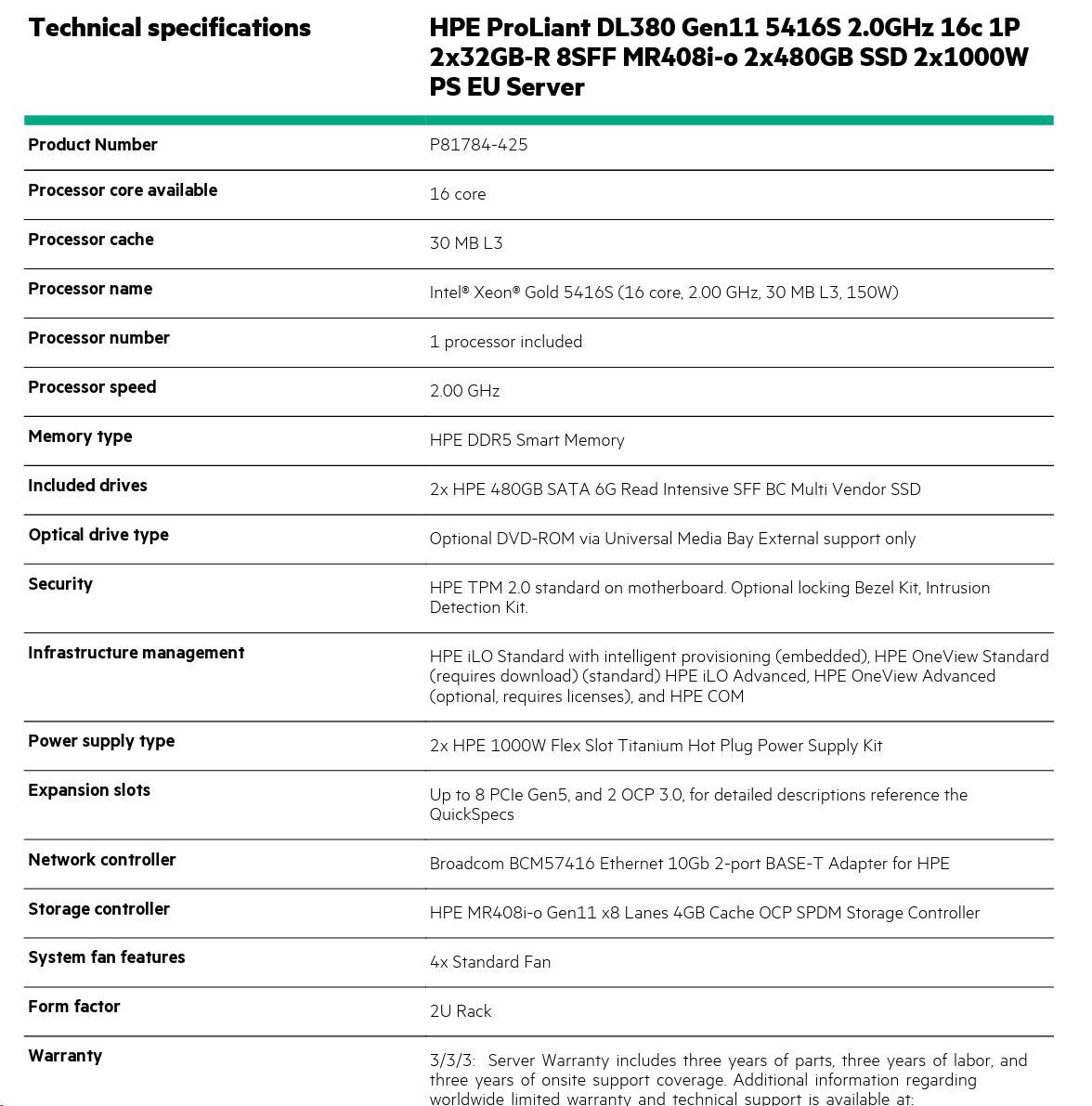 HPE PL DL380g11 5416S (2.0/16C) 2x32G (P43328) 2x480G MR408i-o/4G 8-26SFF 2x1000W 2x10G-T 2U Smart Choice