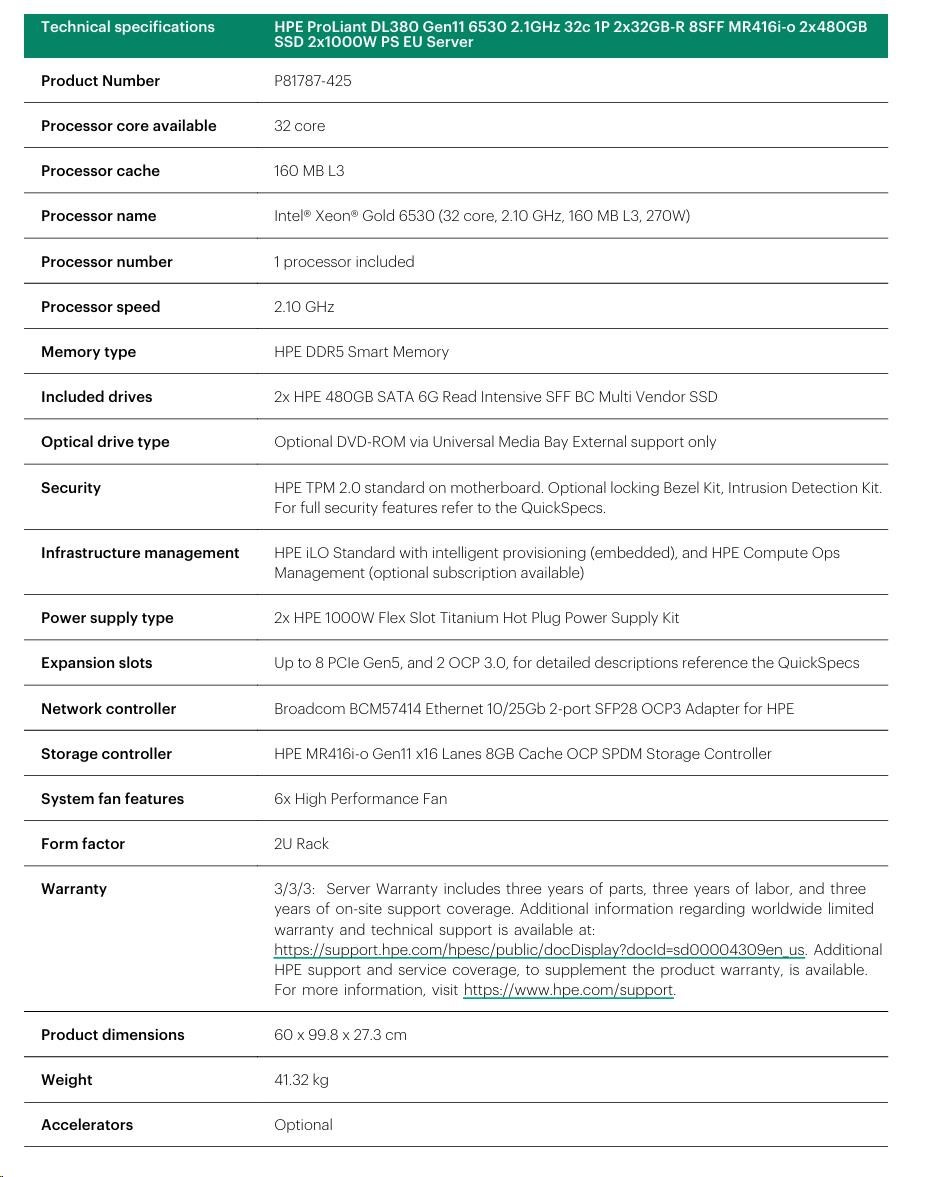| Product Name | HPE ProLiant DL380 Gen11 6530 2.1GHz 32c 1P 2x32GB-R 8SFF MR416i-o 2x480GB SSD 2x1000W PS EU Server |
