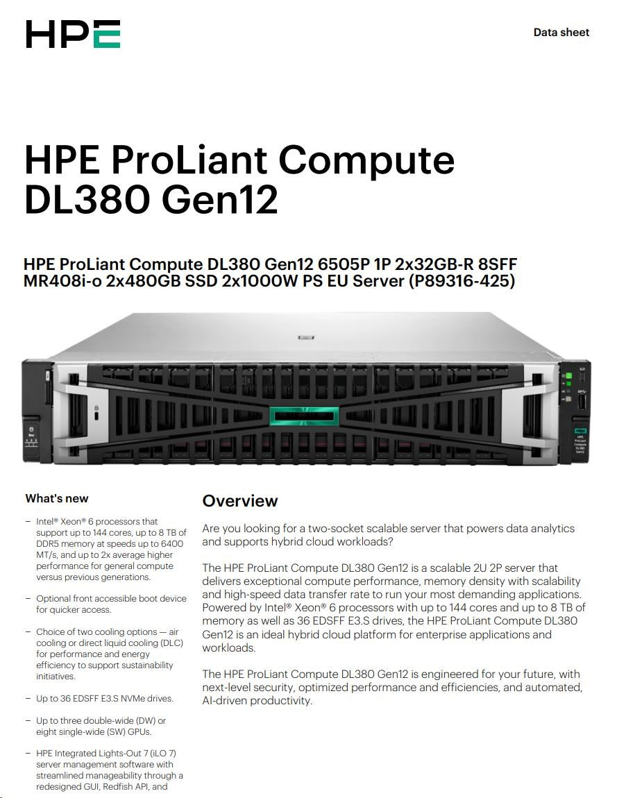 HPE PL DL380g12 6505P (2.2/12C) 2x32G (P69727) 2x8TB MR416i-o 2x1000W 10GbE NBD333 Smart Choice.