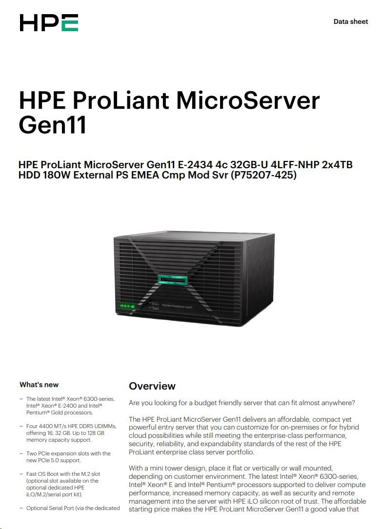 Model Name | HPE ProLiant MicroServer Gen11 E-2434 4c 32GB-U 4LFF-NHP 2x4TB HDD 180W External PS EMEA Cmp Mod Svr |