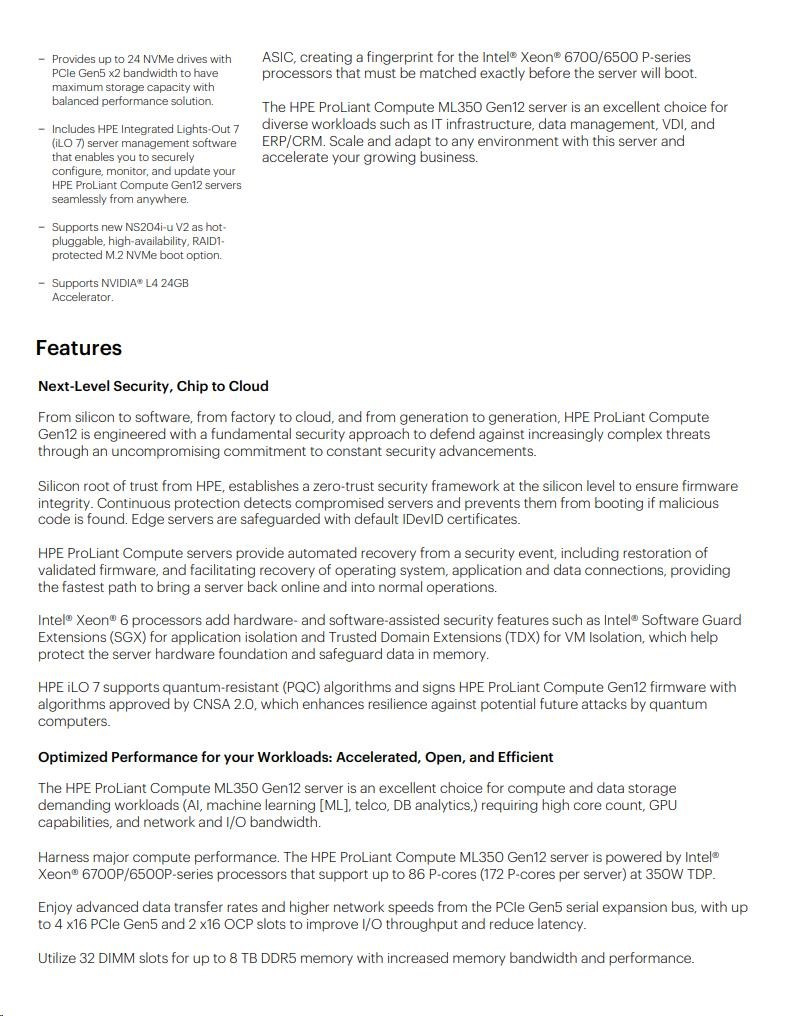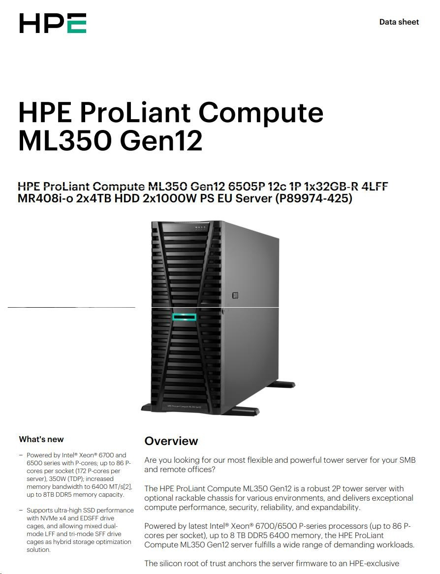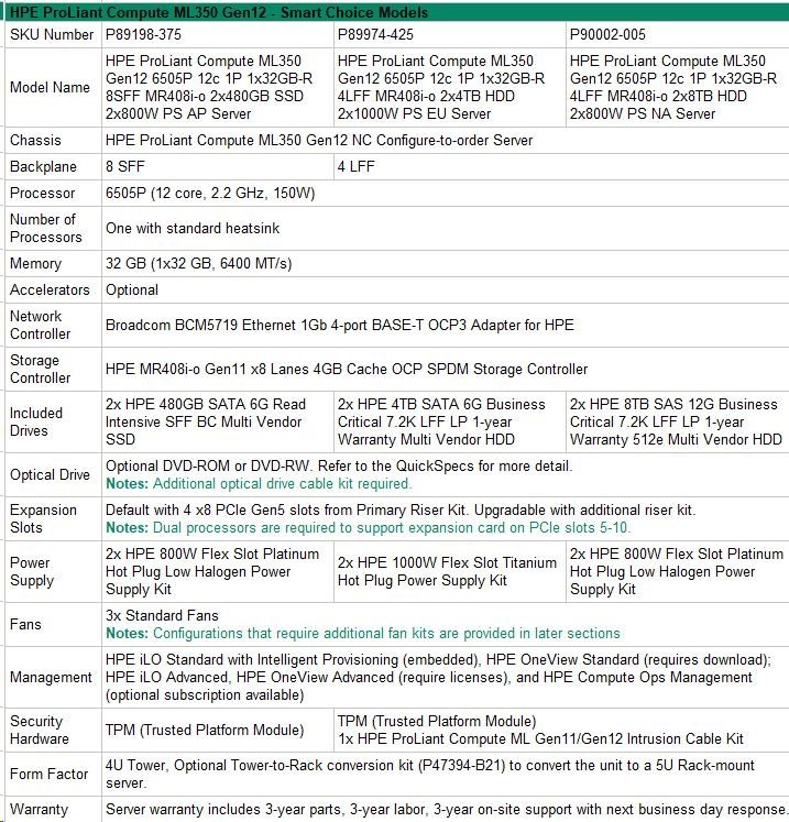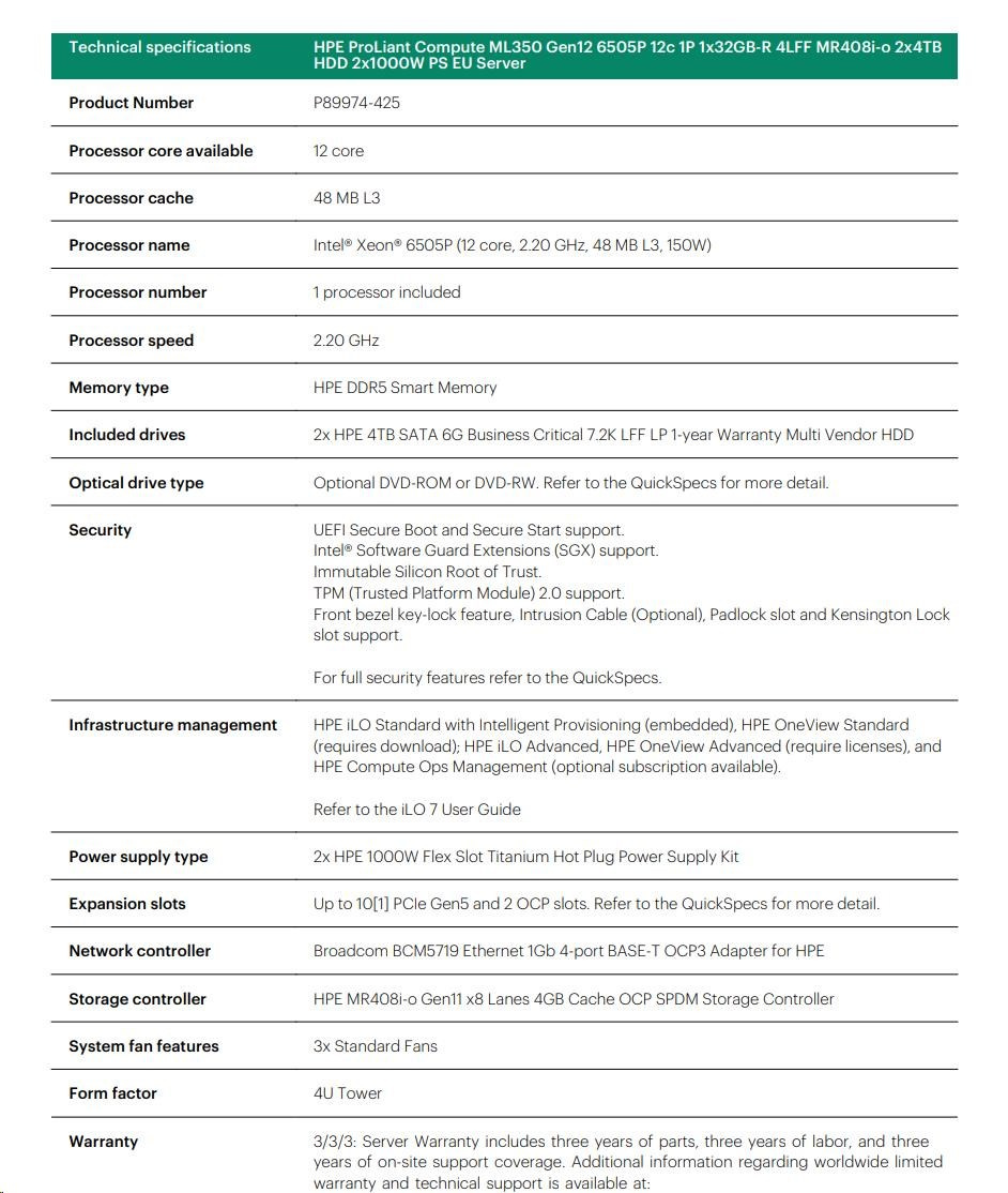 HPE PL ML350g12 6505P (2.2/12C) 1x32G (P69728) 2x4TB 4LFF MR408i-o2x1000W 1GbE NBD333 Smart Choice.