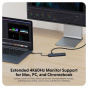 Hyper EcoSmart™ Gen.2 nabízí vše, co potřebujete k plnohodnotné práci na nejnovějšším MacBooku Pro nebo Windows PC. Váš jediný boční port rozšíří na sedm konektorů, kterým dominují hned dva USB-A porty, které umožňují průchozí napájení a plnou rychlost přenosu dat až 10Gbps nebo připojit 5K Thunderbolt displej. Můžete tak současně dobíjet MacBook a zároveň připojit například externí monitor. Dále také získáte port HDMI, USB-C konektor (100W PD 3.0), čtečku karet SD i micro SD a především Gigabit Ethernet.Rozšířená podpora monitorů 4K 60 Hz pro počítače Mac, PC a Chromebook