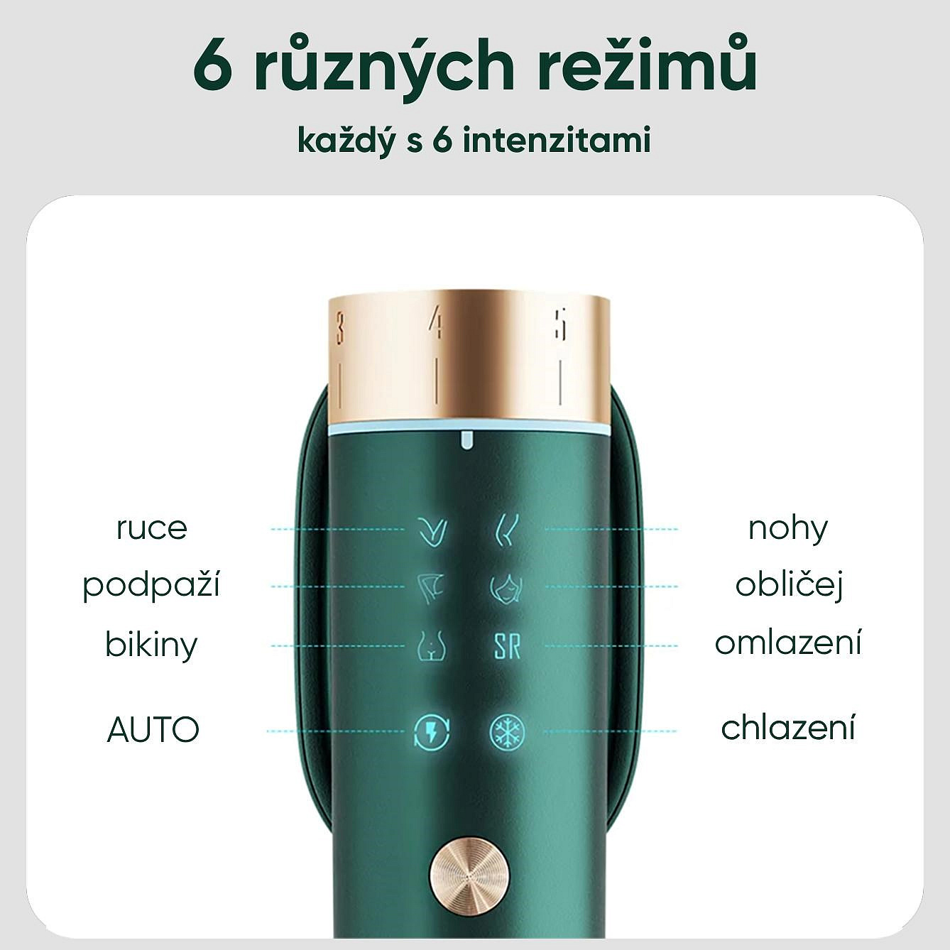 - Přesné cílení na každou partii: 6 specializovaných režimů pro obličej, ruce, nohy, podpaží a oblast bikin s 6 úrovněmi intenzity.