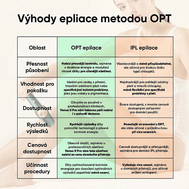 - O 60 % vyšší účinnost: Využívá pokročilou technologii OPT (Optimal Pulse Technology), která je účinnější než tradiční IPL.