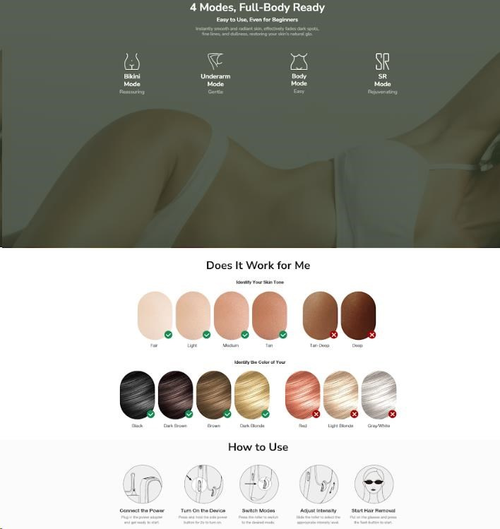 • Cílená péče pro celé tělo: Několik režimů a úrovní intenzity pro bezpečné ošetření nohou, rukou, podpaží, oblasti bikin i obličeje.