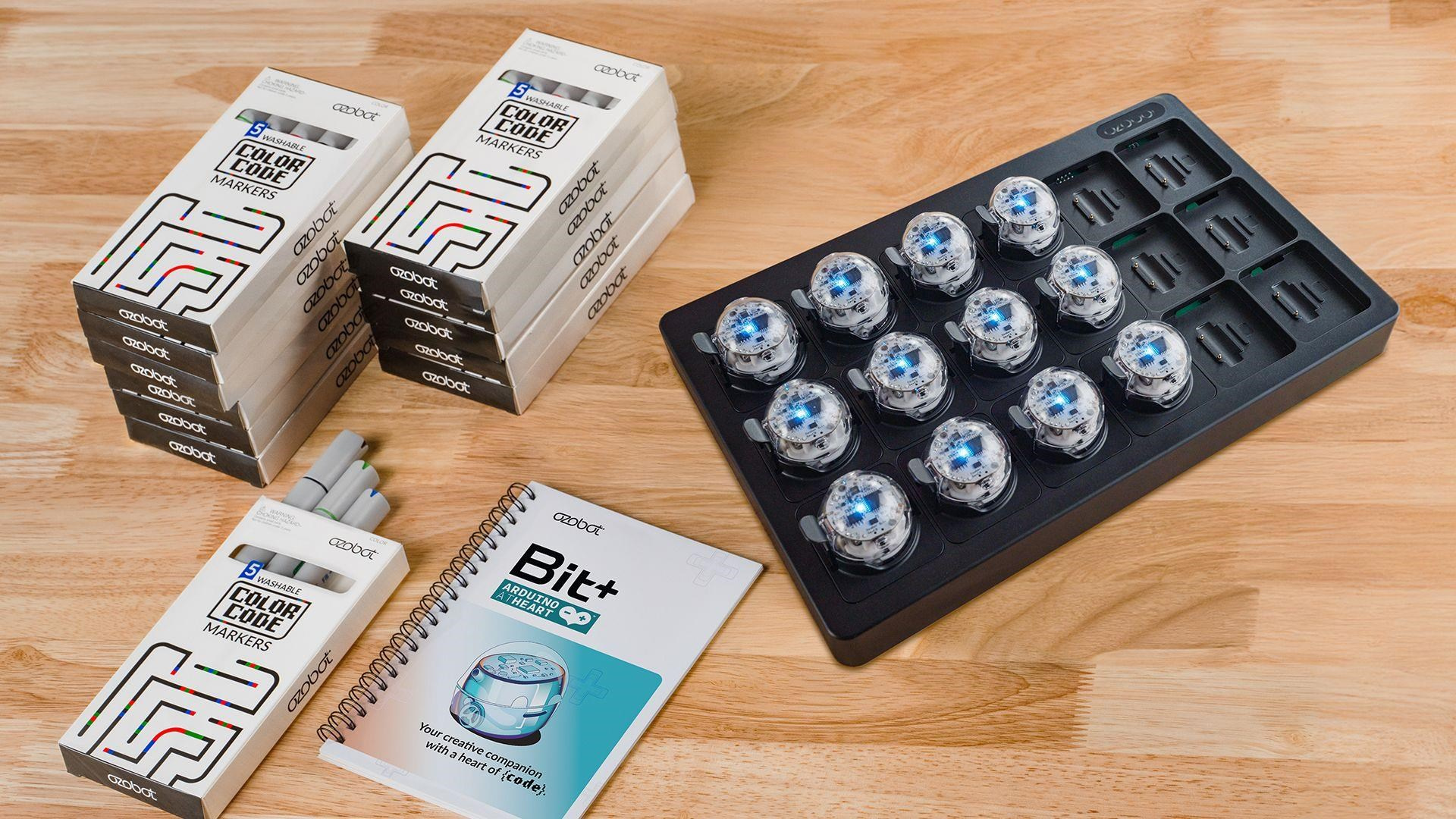 Tato sada pro školy a zájmové kroužky je vybavená vším, co potřebují velké týmy, aby se do zábavného kódování mohly hned pustit. Vedle 12 Ozobotů Bit+ v ní brožurku, které vám pomůže do tajů programování hladce proniknout. Nechybí ani 12 sad omyvatelných oboustranných fix. Radost malým programátorům určitě udělá i množství barevných samolepek. Vhod přijde také bezdrátová nabíjecí matrice s nízkým profilem a skromnými rozměry, aby nikdy nepřekážela.
