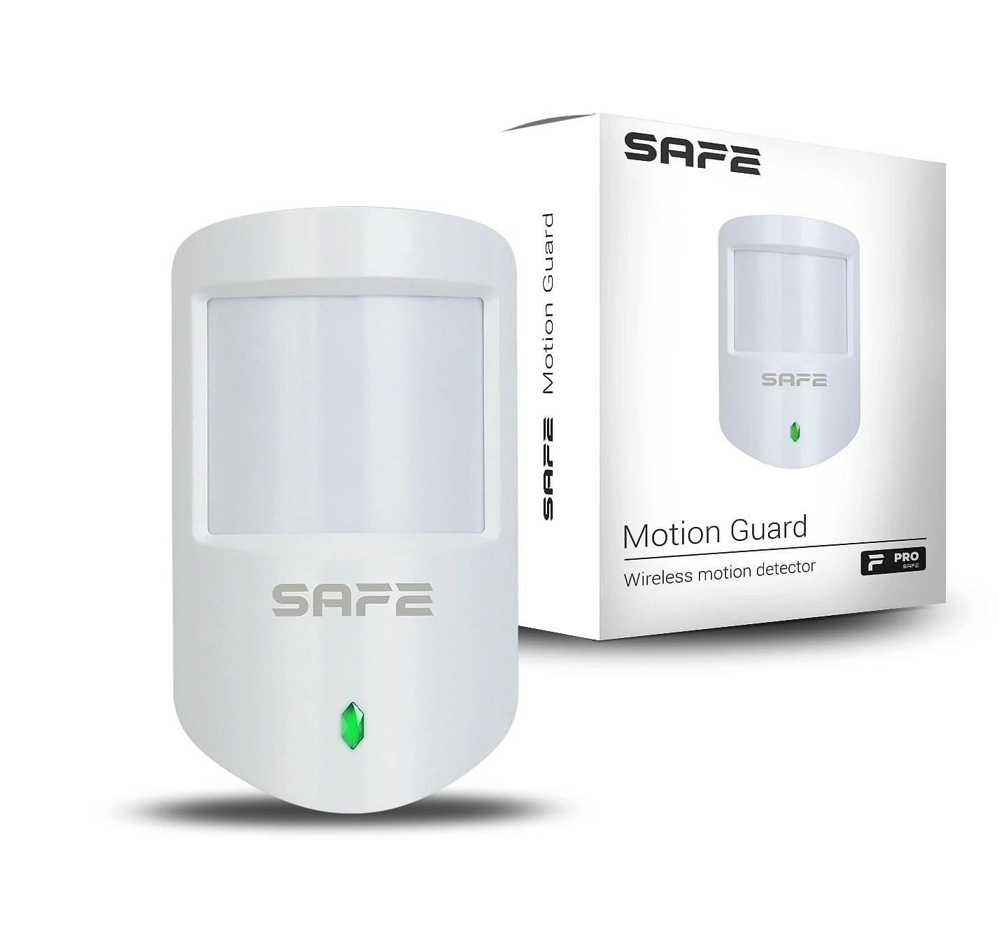 Motion Guard je bezdrátový detektor pohybu vybavený duálním PIR senzorem detekující pohyb ve vzdálenosti až 12 metrů, který je schopen spolehlivě ignorovat pohyb zvířat ve střeženém prostoru (PET imunita) do hmotnosti 18 kg a 50 cm výšky. Díky šifrovanému komunikačnímu protokolu SAFE Keeper zajišťuje bezpečné spojení s centrální ovládací jednotkou zabezpečovacího systému SAFE až na vzdálenost 1 600 metrů v otevřeném prostoru. Detektor je napájen vyměnitelnou baterií typu CR123A, která umožňuje nepřetržitý provoz detektoru po dobu až 4 let..