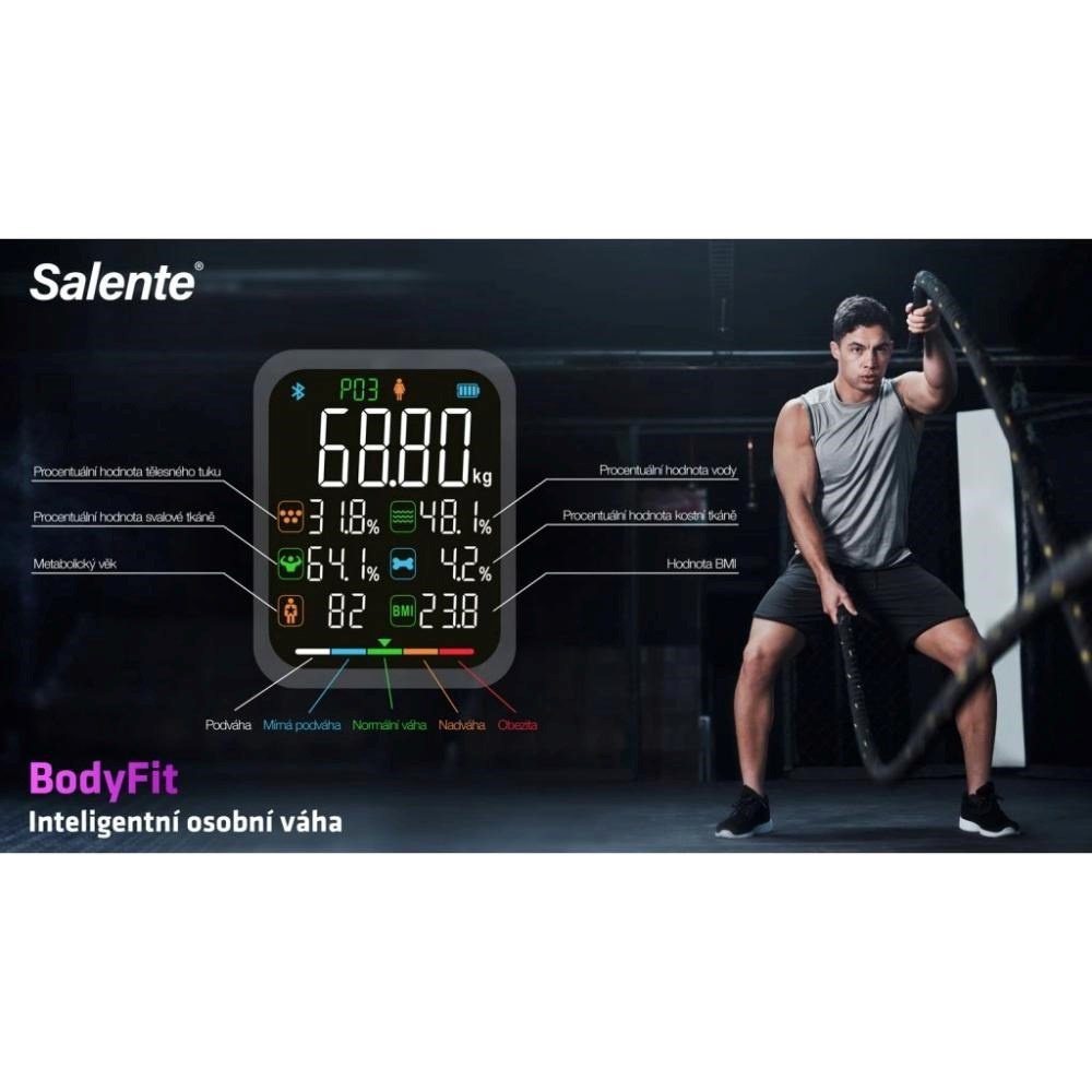 Zapomeňte na nekonečné sledování toho, jestli máte o kilo víc nebo o kilo míň. Salente BodyFit se na vás nedívá jen optikou jednoho čísla. Díky zabudovaným senzorům dokáže změřit a vyhodnotit celkem 15 parametrů – vedle hmotnosti i třeba index BMI, BMR (doporučený denní příjem kalorií), metabolický věk či podíl tuku, svalstva, kostí a vody v těle. A taky vám jasně ukáže, jestli máte podváhu, jste v normě, nebo vás trápí nadváha či obezita. Místo jedné osamocené cifry zkrátka dostanete komplexní mix dat, který vám pomůže pochopit, jestli hubnete chytře, nebo třeba jen ztrácíte vodu. Jde o skvělou volbu pro každého, kdo nechce žít jen „od diety k dietě“, ale touží o svém těle opravdu něco vědět.