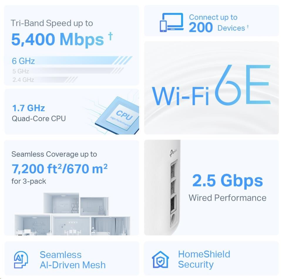 • Wi-Fi 6E pokrytí celé domácnosti – pokryjte plochu až 670 m2 ničím nerušeným Wi-Fi signálem příští generace a zapomeňte na mrtvé zóny pokrytí a načítání do vyrovnávací paměti