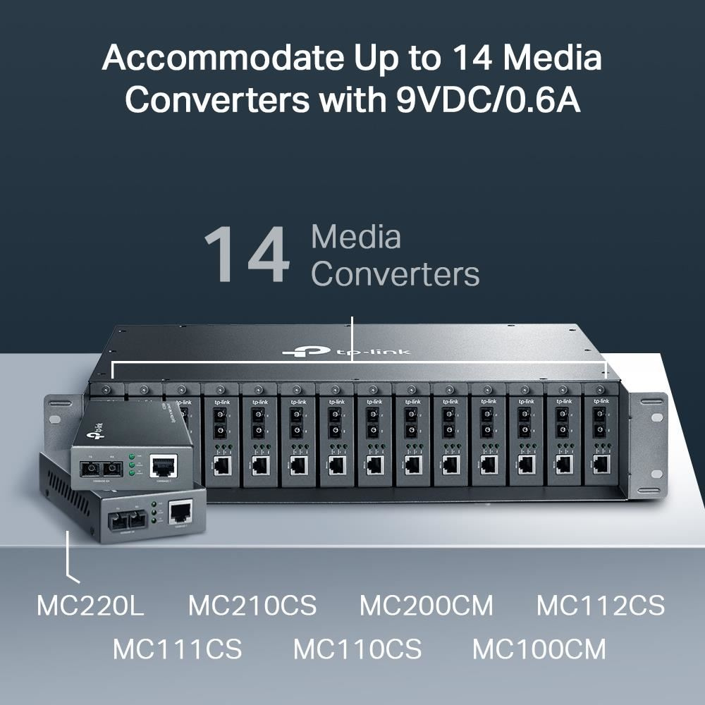 Rackový chassis Omada MC1400 se 14 sloty je speciálně navrženo pro umístění 14 mediálních konvertorů Omada, což umožňuje centrální napájení a šetří místo a kabely. Pro nepřetržitý provoz ve vláknové komunikaci je chassis vybaveno volitelným redundantním napájecím zdrojem a funkcí Hot-Swapping, díky které lze instalovat/odstraňovat konvertory bez vypnutí chassis. K stabilizaci výkonu a prodloužení životnosti jsou uvnitř instalovány dva chladiče. Spolu s mediálními konvertory Omada řady MC Gigabit / Fast Ethernet je MC1400 ideálním řešením pro vaši síť mediální konverze.