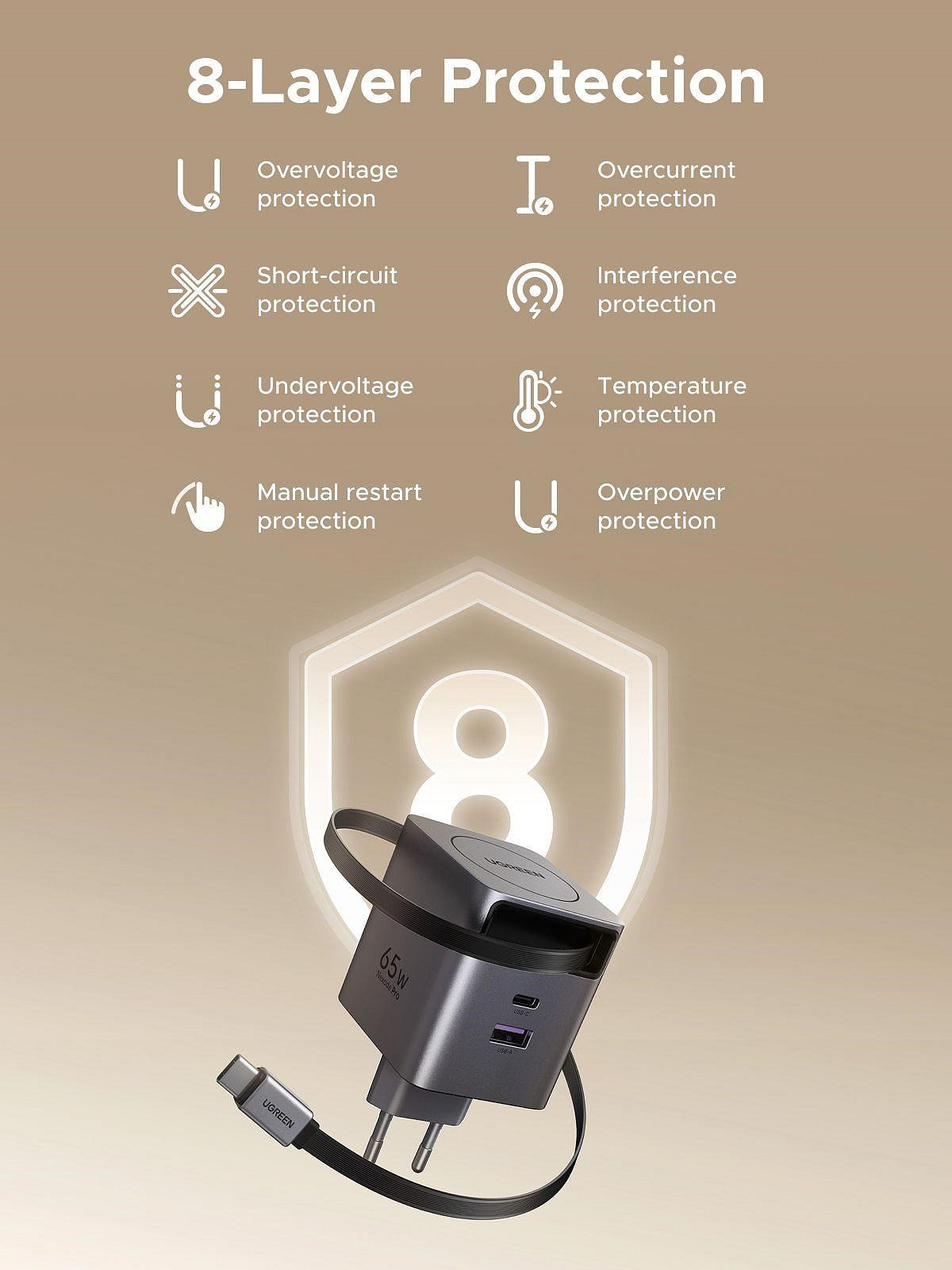 Unikátní zatahovací USB-C kabel (70 cm) je vždy připravený, nikdy se nezamotá a nikdy ho nezapomenete doma. Stačí vytáhnout, nabít, zatáhnout – a můžete jít. - Bezpečnost na prvním místě – 8vrstvá ochrana
